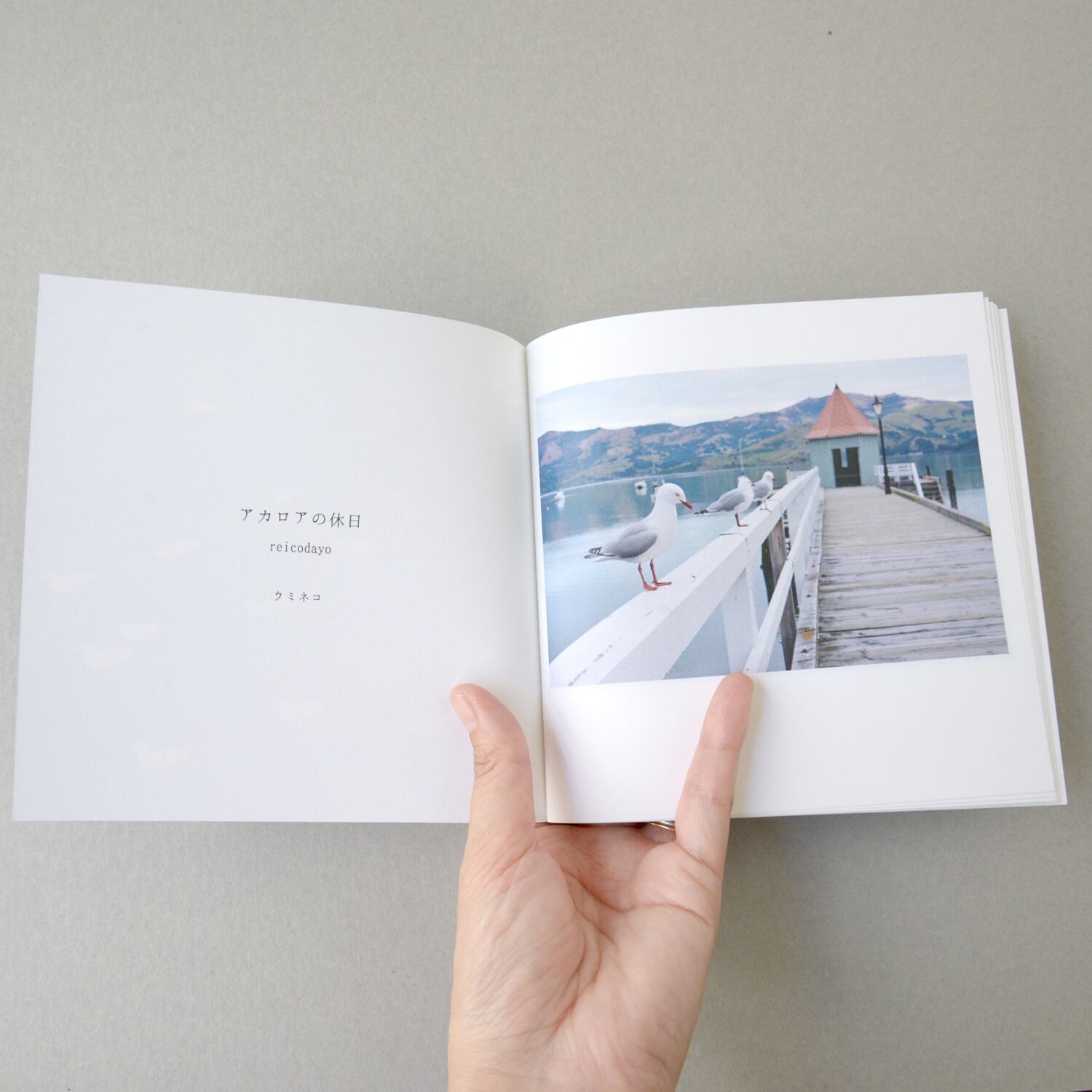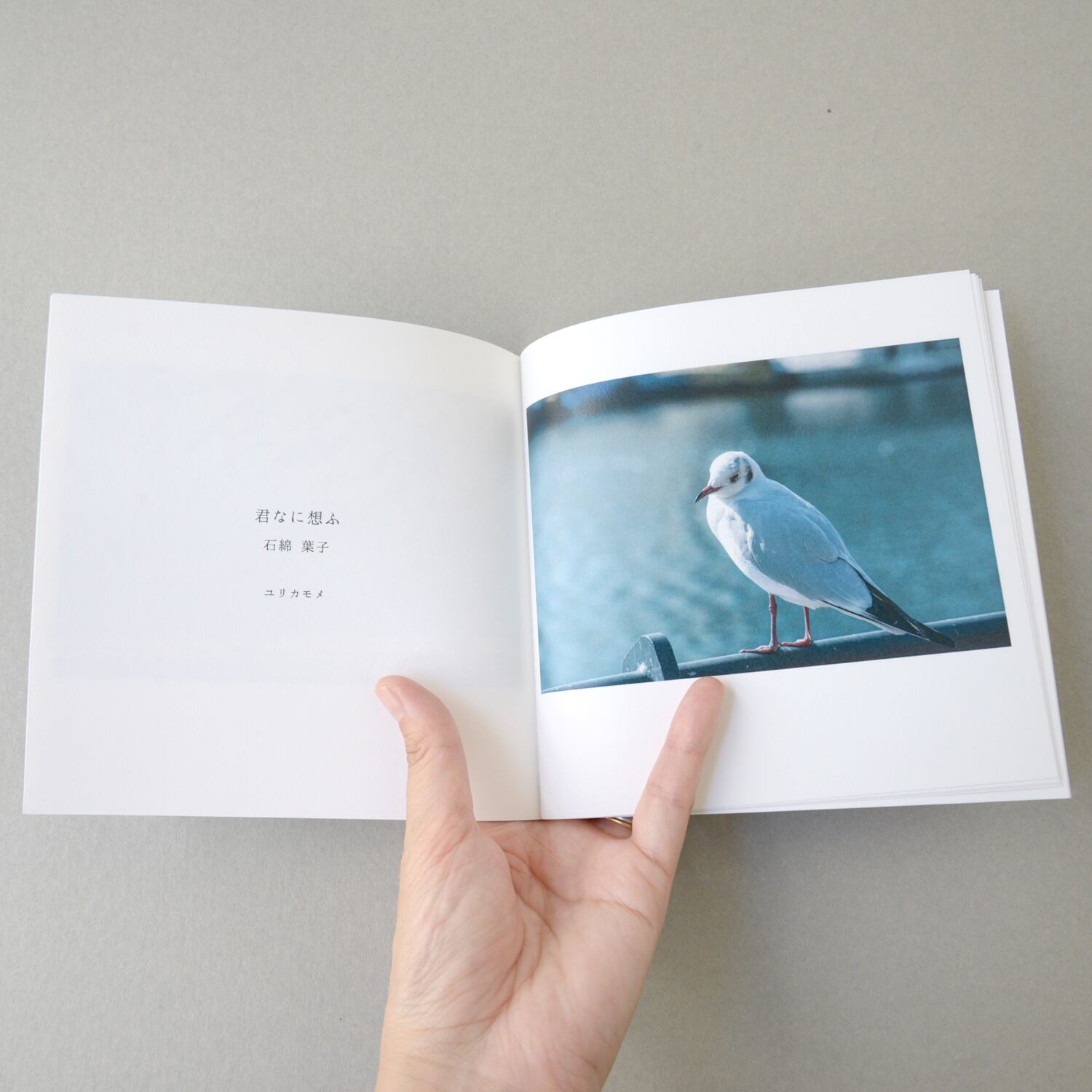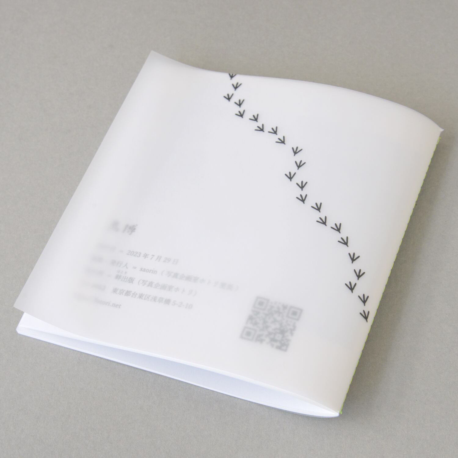 公募展DMの青い池にユリカモメがたくさん浮かんでいる写真が、トレーシングペーパーの表紙から透けて見え、ミシン中綴じの装丁がとてもかわいい1冊です。